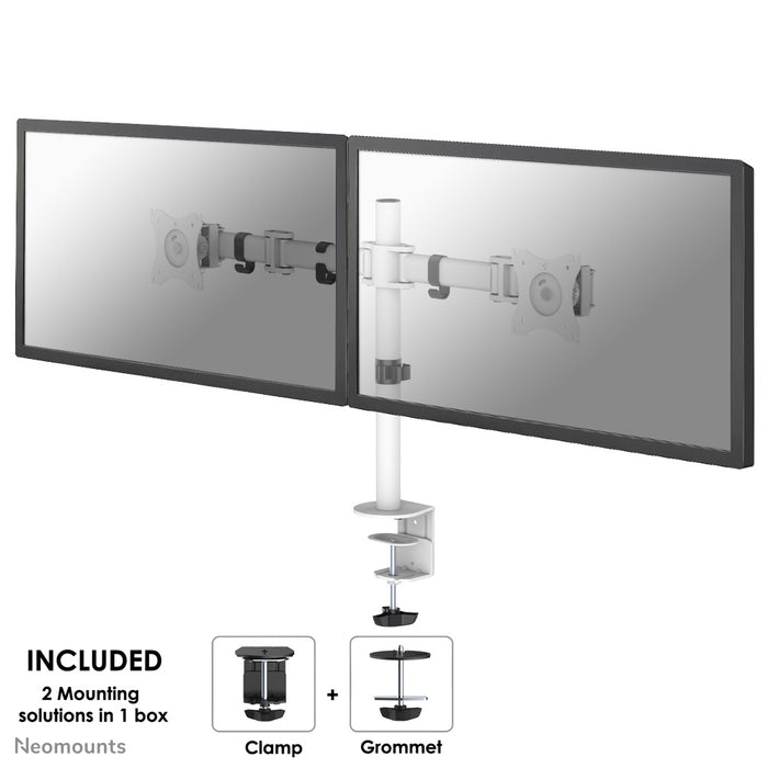 Neomounts NM-D135D wit is een bureausteun voor 2 flat screens t/m 27 inch (69 cm).