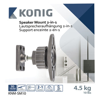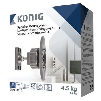 Haal het meeste uit je audio of stereo systeem met de KNM-SM10 speaker steunen van König. Met deze draaibare en kantelbare speakersteunen richt je het geluid naar je toe, zodat films echt je huiskamer binnenkomen en je er helemaal in op kunt gaan. De steun kan een gewicht dragen van 4,5 kg en is geschikt voor bevestiging aan zowel muur als plafond. Hij is uitgevoerd in de kleur zilvergrijs. Ervaar het ultieme geluid met deze speakersteun van König.