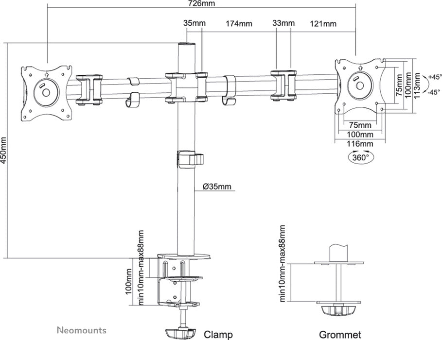 Met deze Neomounts Select monitorarm, model NM-D135DWHITE, bevestigt u twee flatscreens aan het bureau via een bureauklem. Door gebruik te maken van een monitorarm profiteert u optimaal van de mogelijkheden van uw monitor. De monitorarm is eenvoudig in hoogte (0-41,5 cm) en diepte (0-42,7 cm) te verstellen. Tevens kunt u het scherm kantelen, zwenken en roteren. Hierdoor creëert u de ideale ergonomische werkhouding. Dit verkleint de kans op nek- en rugklachten. Kabels zijn netjes weg te werken aan de onderzijde van de horizontale arm. De NM-D135DWHITE heeft 3 draaipunten en is geschikt voor schermen t/m 27" (69 cm). Het draagvermogen van de arm is 8 kg per scherm. Dit product is geschikt voor schermen met een VESA gatenpatroon van 75x75 mm of 100x100 mm. Heeft u een afwijkend (groter) gatenpatroon, dan kunt u dit oplossen met een van onze VESA verloopplaten.