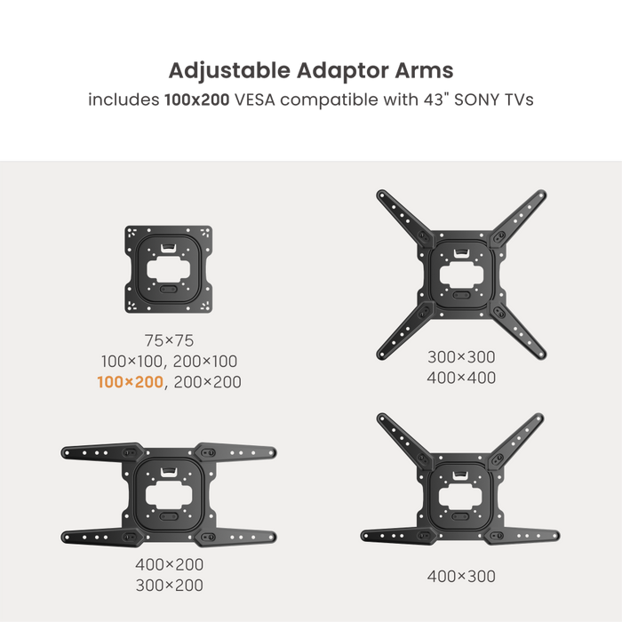 Zorg er vóór de aanschaf van de TV beugel altijd voor dat de VESA-maat van jouw televisie overeenkomt met die van de beugel. De VESA-maat geeft de afstand aan tussen de montagegaten aan de achterzijde van de televisie, waarmee jij deze aan de muurbeugel bevestigt. De TVB-63 is geschikt voor televisies met een VESA-maat van 100x100 tot en met 400x400.