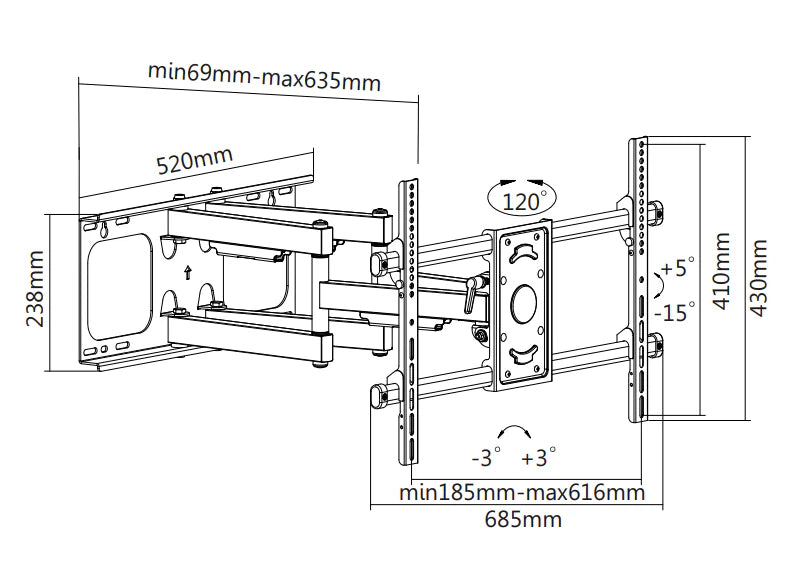 De perfecte ondergrond voor deze muurbeugel is een stenen of betonnen muur. De kracht en hefboomwerking die op de muurplaat komt te staan is enorm. De muurplaat is daarom gemaakt van dikker gepoedercoat staal en vereist een muurmontage met minimaal 5 of 6 muurbouten. De stabiliteit en kracht is dus geheel afhankelijk van de muur. Monteer je deze muurbeugel op een houten plaat, dan zul je zien dat de uitgetrokken TV meebeweegt met de bout.