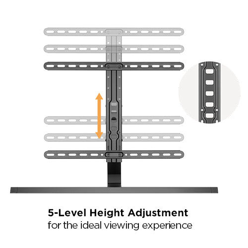 Deze universele TV voet biedt veel flexibiliteit. Je stelt de hoogte in op 5 verschillende niveaus. Dit zorgt voor een optimale kijkervaring. De afneembare uitbreidingsplaat maakt de standaard geschikt voor grotere tv’s. De maximale belasting is 40 kg. Het scherm kan +5 en -10 graden gekanteld worden. Daarnaast is de voet draaibaar tot +/- 35 graden.